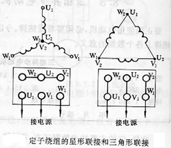 如果U1、V1 、W1分別為三相繞組的始端(頭) ,則U2、V2、W2是相應(yīng)的末端(尾)。這六個引出線端在接電源之前,相互間必須正確聯(lián)接。聯(lián)接方法有星形(Y)聯(lián)接和三角形( )聯(lián)接兩種(下圖所示)。通常三相異步電動機自3kW以下者,聯(lián)接成星形;自4kW以上者, 聯(lián)接成三角形。