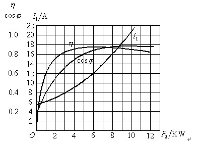 當電動機空載時,轉(zhuǎn)子轉(zhuǎn)速接近于旋轉(zhuǎn)磁場的同步轉(zhuǎn)速,兩者之間相對轉(zhuǎn)速很小,所以轉(zhuǎn)子電流近似為零,這時定子電流幾乎全為建立旋轉(zhuǎn)磁場的勵磁電流。當輸出功率增大時,轉(zhuǎn)子電流和定子電流都隨著相應(yīng)增大,如下圖中的I1=f(P2)曲線所示。